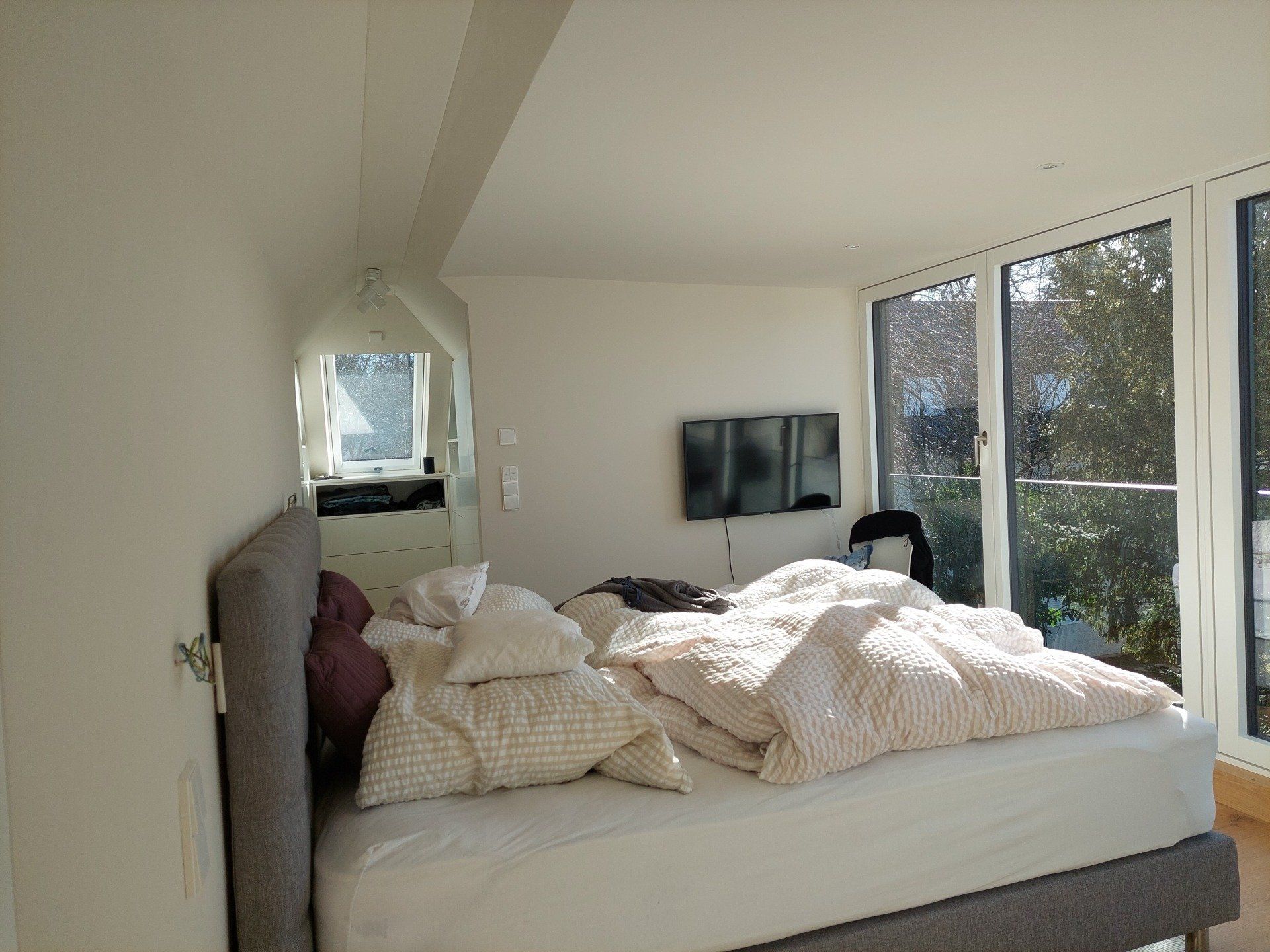 Durch den Einbau einer breiten Dachgaube mit durchgehender Fensterfront, konnte das zunächst niedrige Dachgeschoss optimal zu einem großzügigen Elternschlafraum mit begehbarem Kleiderschrank ausgebaut werden. Das Dach wurde innen vollständig neu gedämmt.